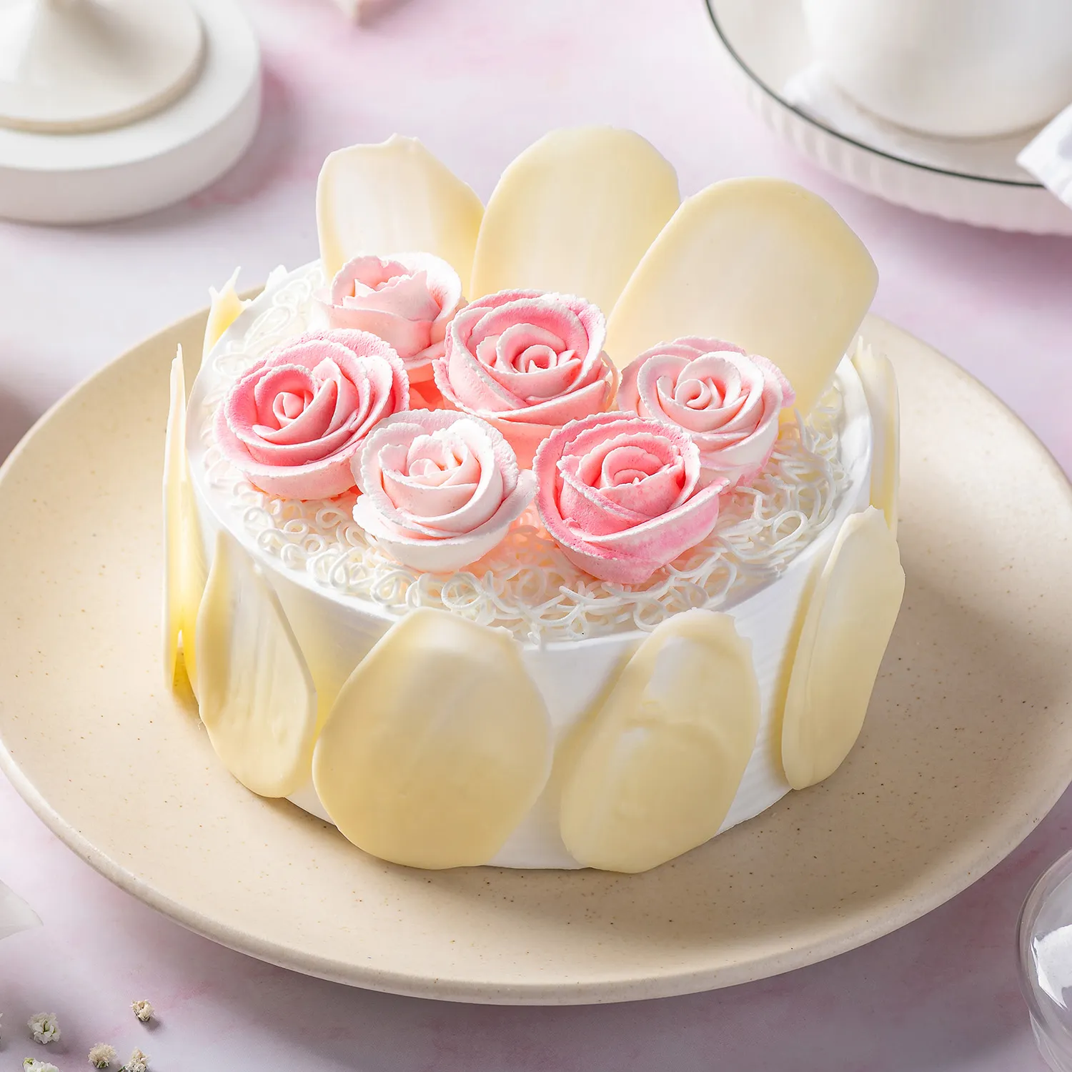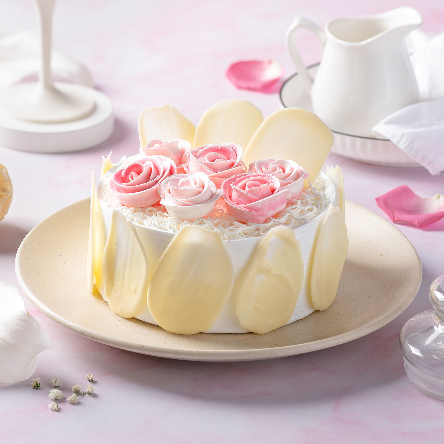 this cake offers a delightful first bite, where the delicate rose flavour dances with the subtle sweetness of white chocolate. The sponge is exceptionally light and airy, practically melting in your mouth. The smooth cream frosting provides a beautiful counterpoint, adding a touch of richness without being heavy.