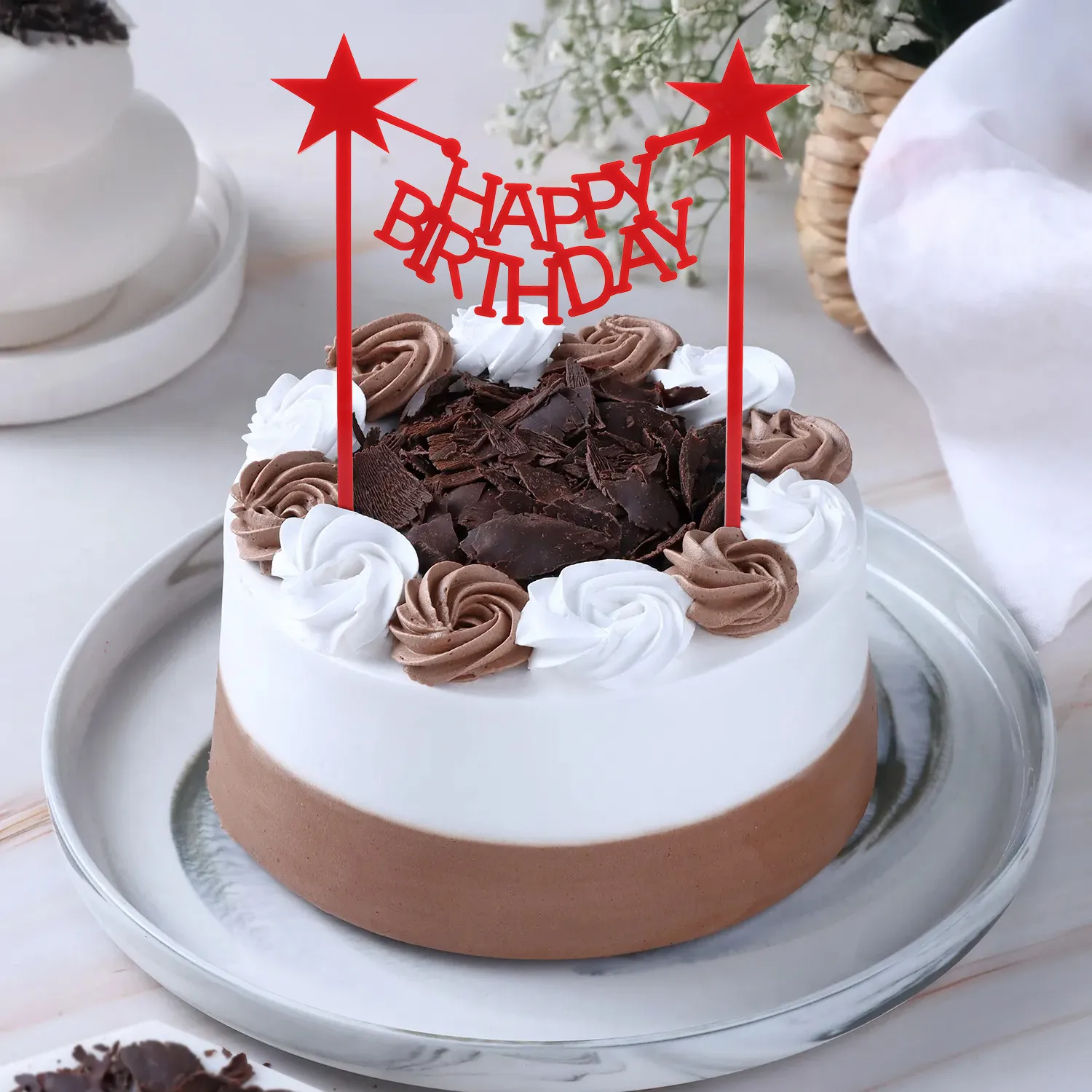 This cream cake offers a subtle sweetness rather than intense chocolate flavour. The light vanilla cream is a gentle contrast to the delicate cocoa sponge. Imagine taking a bite — the airy texture and light moisture making it easy to enjoy.