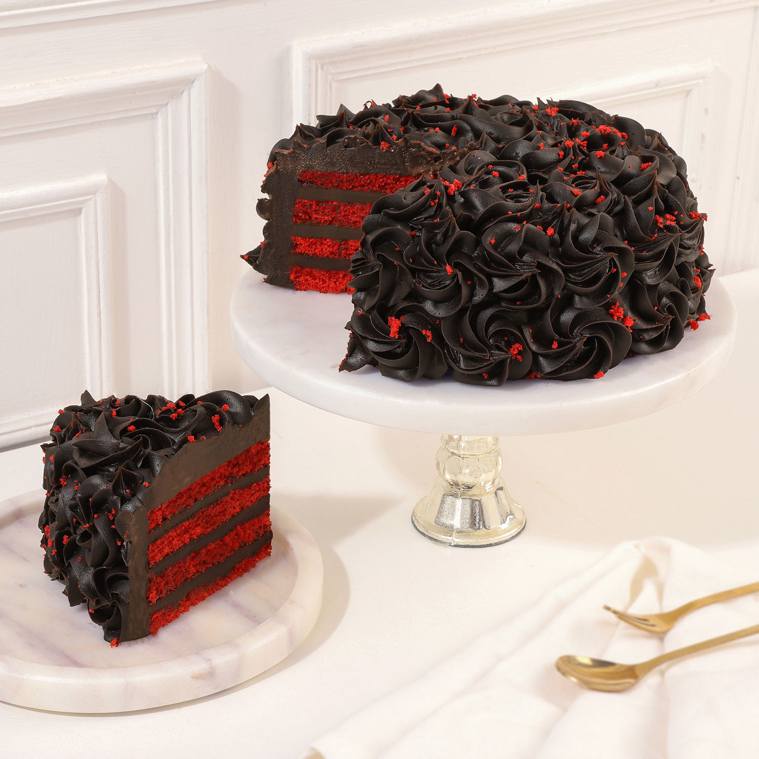 - Features alternating layers of red velvet and chocolate sponge